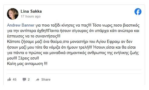 Συγκεκριμένα, όπως αποκάλυψε η Λίνα Σακκά ο καλός της φίλος Andrew Banner άφησε την τελευταία του πνοή, με την ίδια να περιγράφει μέσα από την ανάρτησή της το στενό τους δέσιμο αλλά και, μία ιδιαίτερη εμπειρία που έζησαν μαζί στο μοναστήρι του Αγίου Εφραίμ.