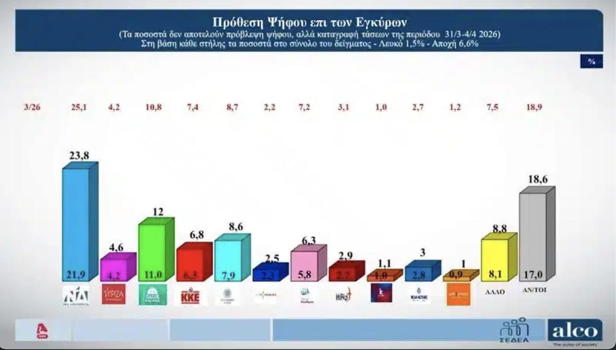 Δημοσκόπηση Alco: Απώλειες για τη ΝΔ λόγω ΟΠΕΚΕΠΕ – Διαφορά 11,8% από το ΠΑΣΟΚ