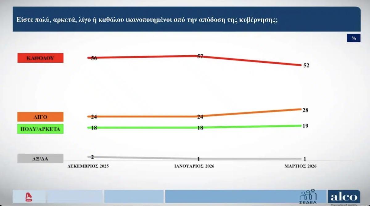 ενώ το 52% «καθόλου» ως προς την ικανοποίηση από την απόδοση της κυβέρνησης. Το 28% απαντά «λίγο» και το 19% «πολύ/αρκετά».