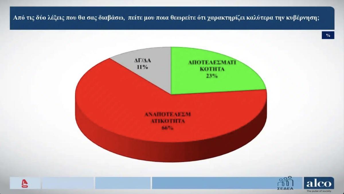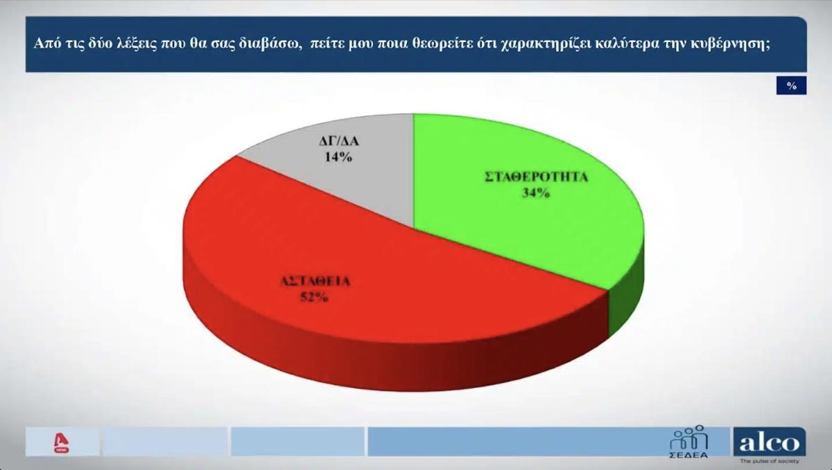 Η λέξη «αστάθεια» είναι αυτή που χαρακτηρίζει την κυβέρνηση σε ποσοστό 52% ενώ το 34% – ποσοστό σαφώς υψηλότερο από την εικόνα της ΝΔ στην πρόθεση ψήφου – απαντά πως η «σταθερότητα» χαρακτηρίζει την κυβέρνηση.