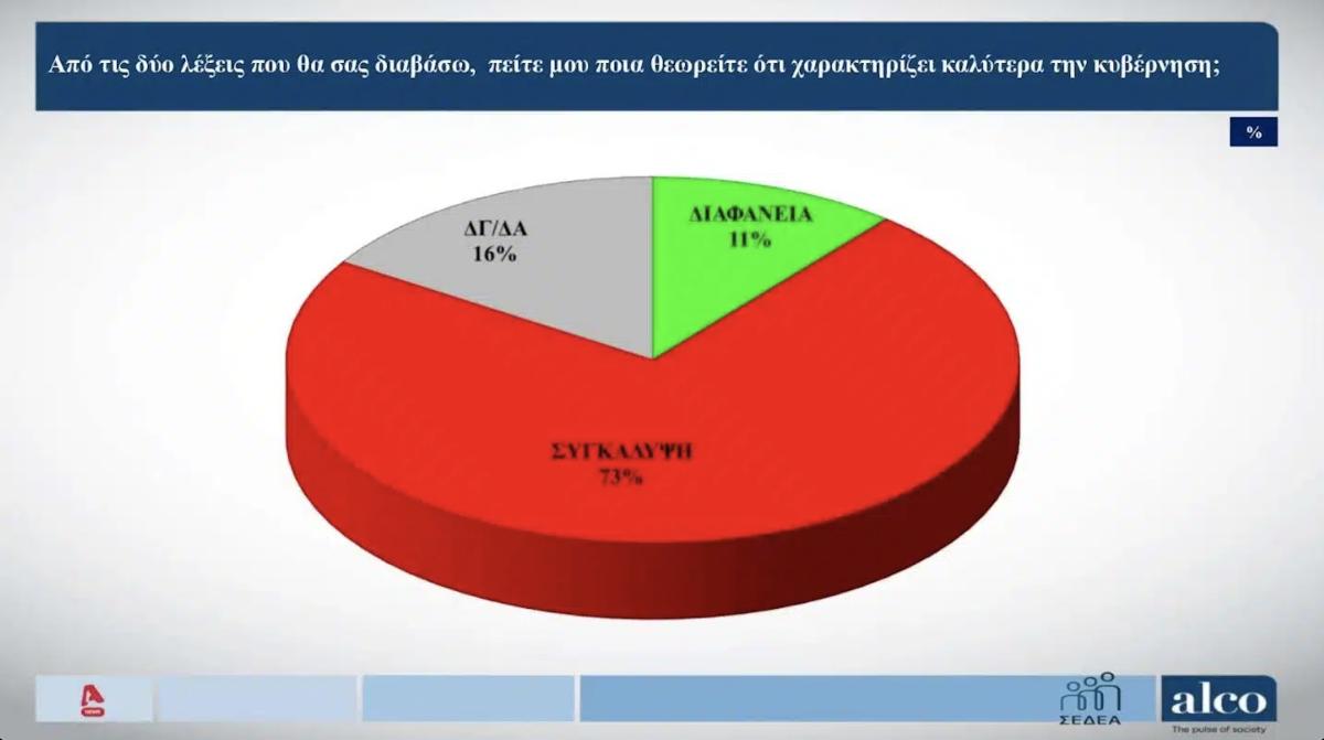 Το 73% θεωρεί πως η λέξη «συγκάλυψη» είναι εκείνη που χαρακτηρίζει καλύτερα την κυβέρνηση. Ενώ μόλις το 11% απαντά η