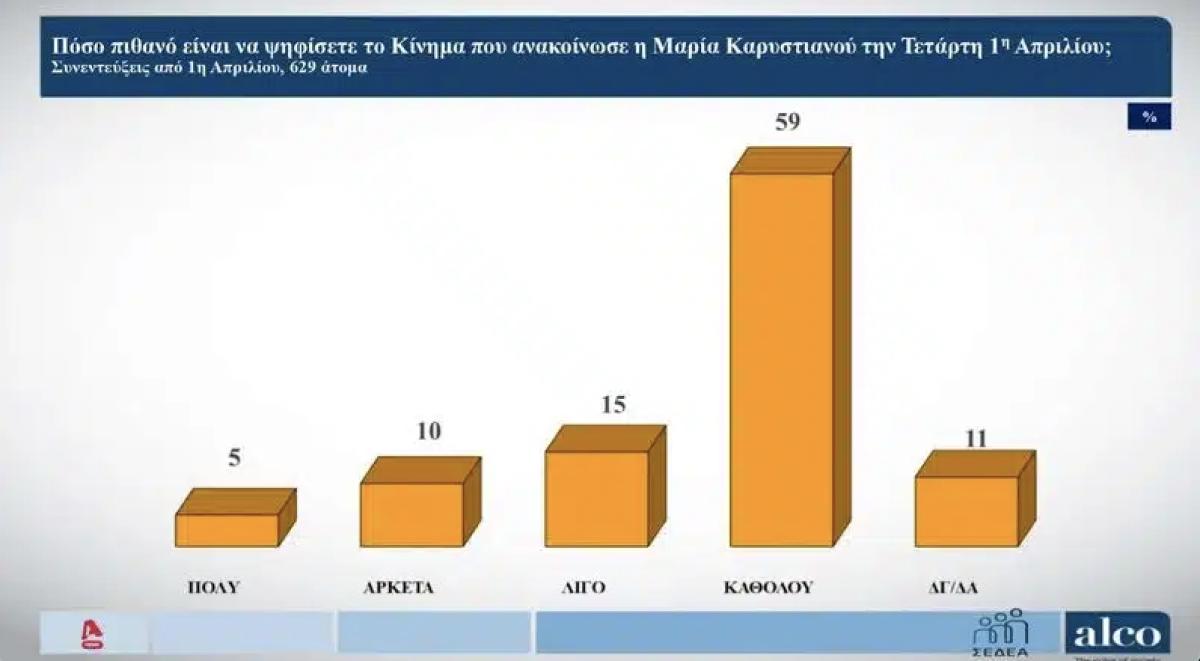 Ένα ποσοστό που αθροιστικά φθάνει στο 15% εμφανίζει η Μαρία Καρυστιανού στο ερώτημα πόσο πιθανό είναι να ψηφίσετε το κόμμα που ανακοίνωσε την προηγούμενη Τετάρτη. «Λίγο» απαντά το 15% ενώ το 59% λέει «καθόλου».