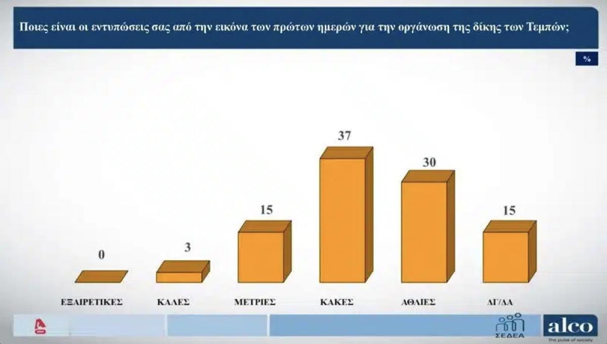 Τα όσα συνέβησαν κατά τη διάρκεια της πρώτης ημέρας της δίκης των Τεμπών προκάλεσαν αποστροφή στο μεγαλύτερο τμήμα του εκλογικού σώματος. Το 37% μιλά για «κακές εντυπώσεις», το 30% για «άθλιες» ενώ το 15% για «μέτριες».