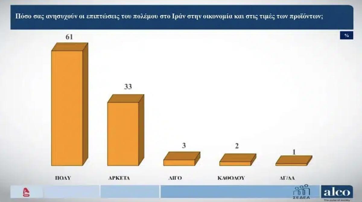Περισσότεροι από εννέα στους 10 ερωτηθέντες δεν κρύβουν την ανησυχία τους για τις επιπτώσεις του πολέμου στο Ιράν στην οικονομία και στις τιμές των προϊόντων. Το 61% απαντά «πολύ» και το 33% «αρκετά».