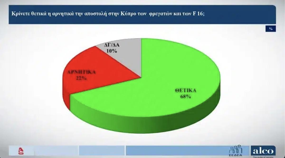 Το 68% των ερωτηθέντων κρίνει θετικά την απόφαση για αποστολή στην Κύπρο των δυο φρεγατών και των F16 ενώ αντίθετη άποψη εκφράζει το 22%.
