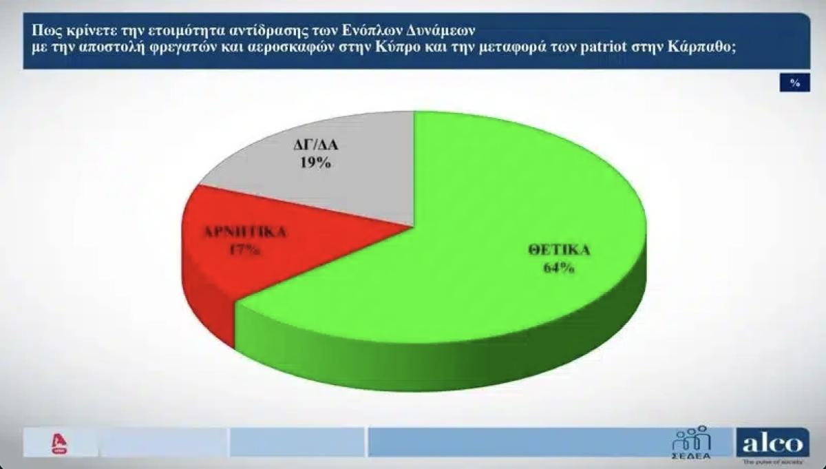 Σε αντίστοιχα ποσοστά -64%- κρίνεται ως θετική η απόφαση για τη μεταφορά των patriot στην Κάρπαθο και γενικότερα η ετοιμότητα αντίδρασης των Ενόπλων Δυνάμεων. Αρνητική κρίση διατυπώνει το 17%.