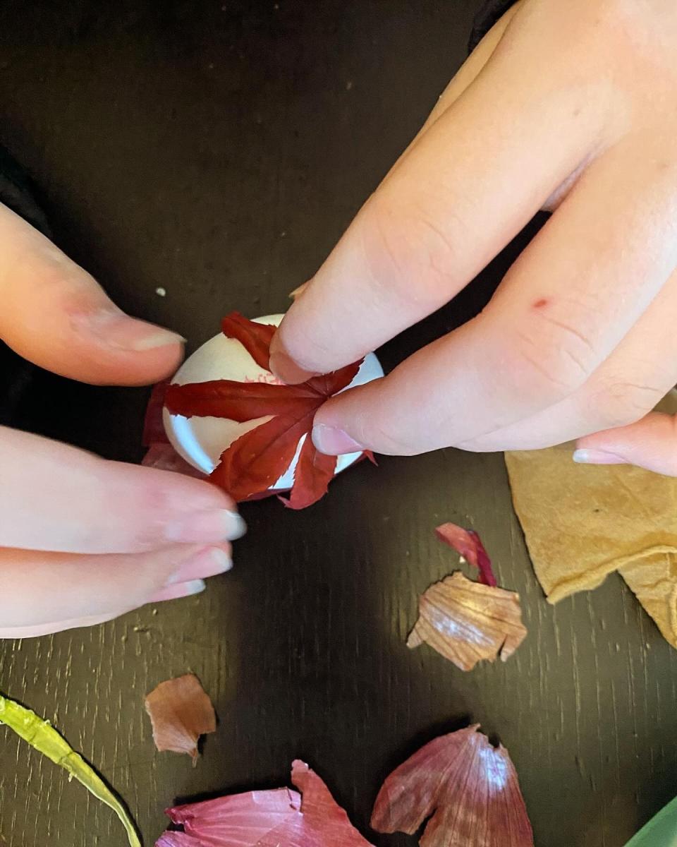 Η αγαπημένη παρουσιάστρια είχε μπει στην κουζίνα μαζί με τα παιδιά της, την Αέλια και τον Αρίωνα, και όλοι μαζί δημιούργησαν μικρά… έργα τέχνης, χρησιμοποιώντας φύλλα, τσόφλια από κρεμμύδια, φυσικές βαφές και απλά υλικά όπως τούλι.