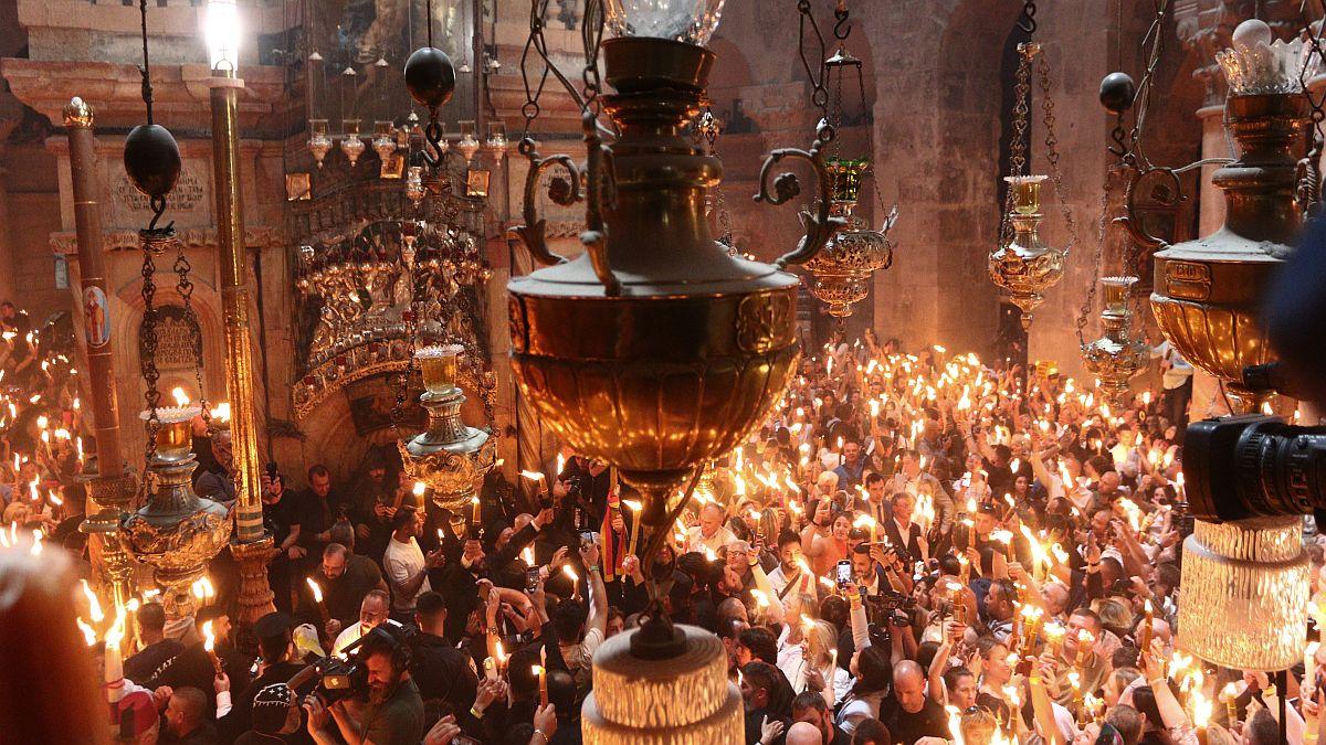 Την υποδοχή του Αγίου Φωτός από τον Πατριάρχη Ιεροσολύμων.