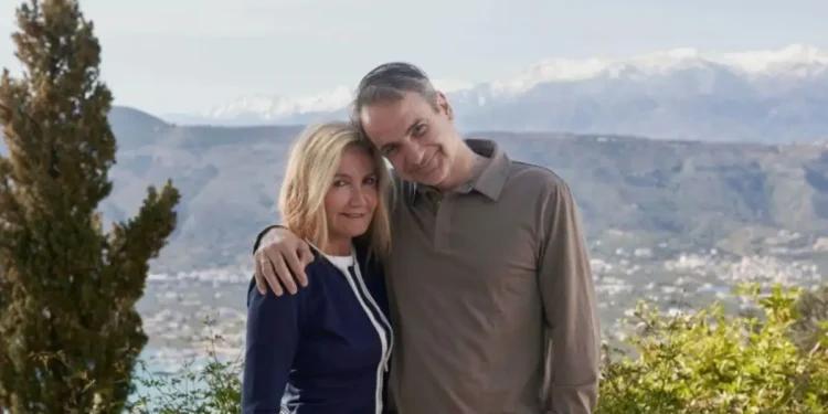 Στο στιγμιότυπο, ποζάρει αγκαλιά με τη σύζυγό του, Μαρέβα Γκραμπόφσκι Μητσοτάκη, αποπνέοντας οικογενειακή ζεστασιά και γιορτινό κλίμα.