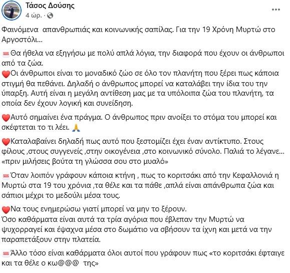 Στο κείμενο του που δημοσιεύτηκε στον προσωπικό του λογαριασμό στο facebook ο δημοσιογράφος τα βάζει με ένα κομμάτι της κοινωνίας που έχει την άποψή πως για ό,τι συνέβη στην Κεφαλονιά φταίει η Μυρτώ.