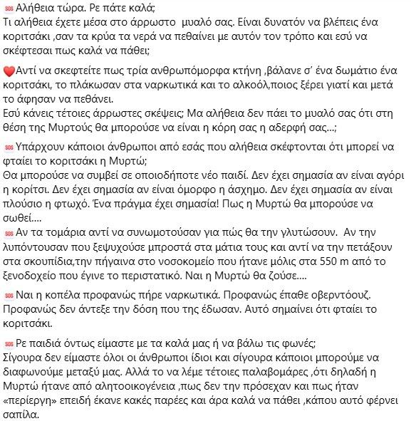 Σίγουρα δεν είμαστε όλοι οι άνθρωποι ίδιοι και σίγουρα κάποιοι μπορούμε να διαφωνούμε μεταξύ μας. Αλλά το να λέμε τέτοιες παλαβομάρες ,ότι δηλαδή η Μυρτώ ήτανε από αλητοοικογένεια ,πως δεν την πρόσεχαν και πως ήταν «περίεργη» επειδή έκανε κακές παρέες και άρα καλά να πάθει ,κάπου αυτό φέρνει σαπίλα.