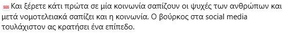 ????Και ξέρετε κάτι πρώτα σε μία κοινωνία σαπίζουν οι ψυχές των ανθρώπων και μετά νομοτελειακά σαπίζει και η κοινωνία. Ο βούρκος στα social media τουλάχιστον ας κρατήσει ένα επίπεδο.