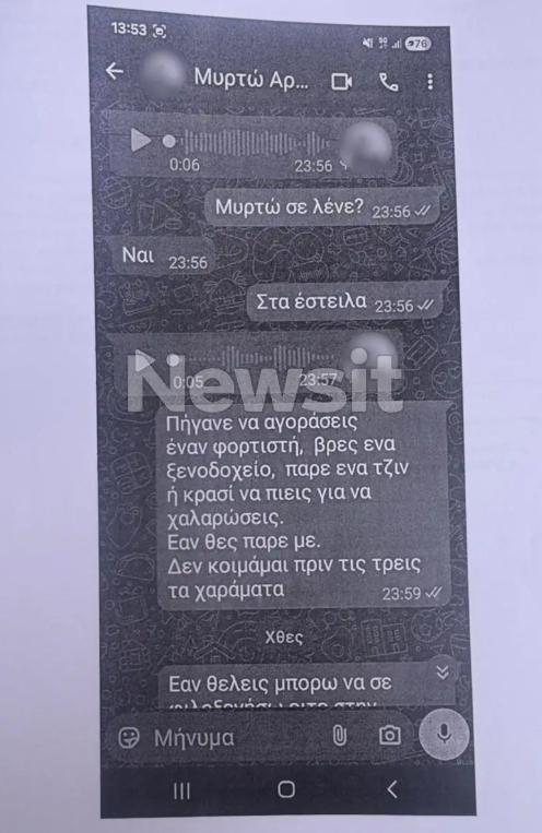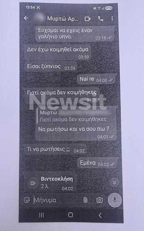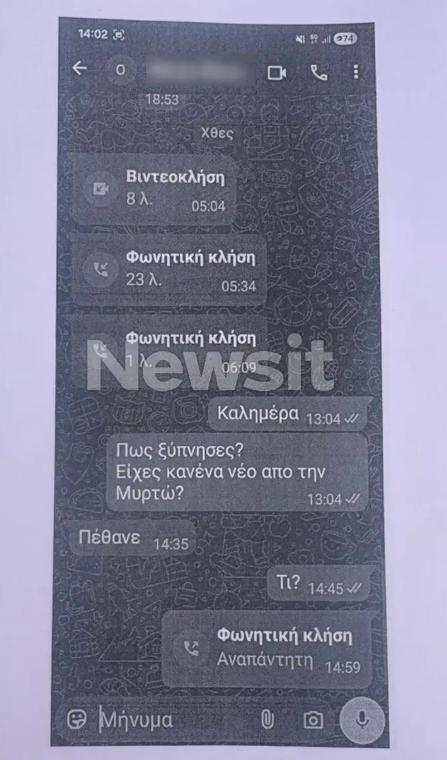 Όπως αποδεικνύεται από τα μηνύματα, η κοπέλα φαίνεται να ήταν ζωντανή έως τις 4 το πρωί της Τρίτης. Και αυτό γιατί στις 04:02 τα ξημερώματα της, η Μυρτώ επικοινώνησε με τον φίλο της μέσω βιντεοκλήσης.
