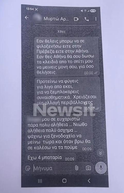 «Αν θέλεις μπορώ να σε φιλοξενήσω είτε στην Πρέβεζα είτε στην Αθήνα. Αν θες Αθήνα θα σου δώσω τα κλειδιά από το σπίτι μου να μείνεις μόνη σου για όσο θέλεις. Προτείνω να φύγεις για λίγο από εκεί για να ξεμπλοκάρεις συναισθηματικά. Χρειάζεσαι μια αλλαγή περιβάλλοντος», της λέει.