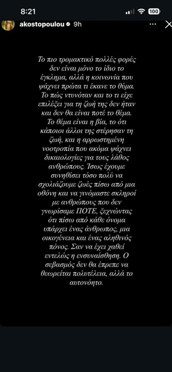 “Το πιο τρομακτικό πολλές φορές δεν είναι μόνο το ίδιο το έγκλημα, αλλά η κοινωνία που ψάχνει πρώτα τι έκανε το θύμα. Το πώς ντυνόταν και τι είχε επιλέξει για τη ζωή της δεν θα ήταν και θα είναι ποτέ το θέμα. Το θέμα είναι η βία και πως κάποιοι άλλοι της στέρησαν τη ζωή και η αρρωστημένη νοοτροπία που ακόμα ψάχνει δικαιολογίες για τους λάθους ανθρώπους. Ίσως έχουμε συνηθίσει τόσο πολύ να σχολιάζουμε ζωές πίσω από μία οθόνη και να γινόμαστε σκληροί με ανθρώπους που δεν γνωρίσαμε ποτέ, ξεχνώντας ότι πίσω από κάθε όνομα υπάρχει ένας άνθρωπος, μία οικογένεια και ένας αληθινός πόνος. Σα να έχει χαθεί εντελώς η εσυναίσθηση. Ο σεβασμός δεν θα έπρεπε να θεωρείται πολυτέλεια αλλά το αυτονόητο”, έγραψε η Αλεξάνδρα Κωστοπούλου.