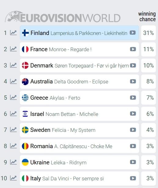 Η Φινλανδία παραμένει σταθερά στην πρώτη θέση με τον τραγούδι «Liekinheitin», με πιθανότητα νίκης 30%, ενώ ακολουθεί η Γαλλία και η Δανία. Την τέταρτη θέση πλέον κατέχει η Αυστραλία, με το «Eclipse». Μετά την Ελλάδα, στην έκτη θέση βρίσκεται το Ισραήλ, στη έβδομη βρίσκεται η Σουηδία και τη δεκάδα συμπληρώνουν η Ρουμανία, η Ουκρανία και η Ιταλία.