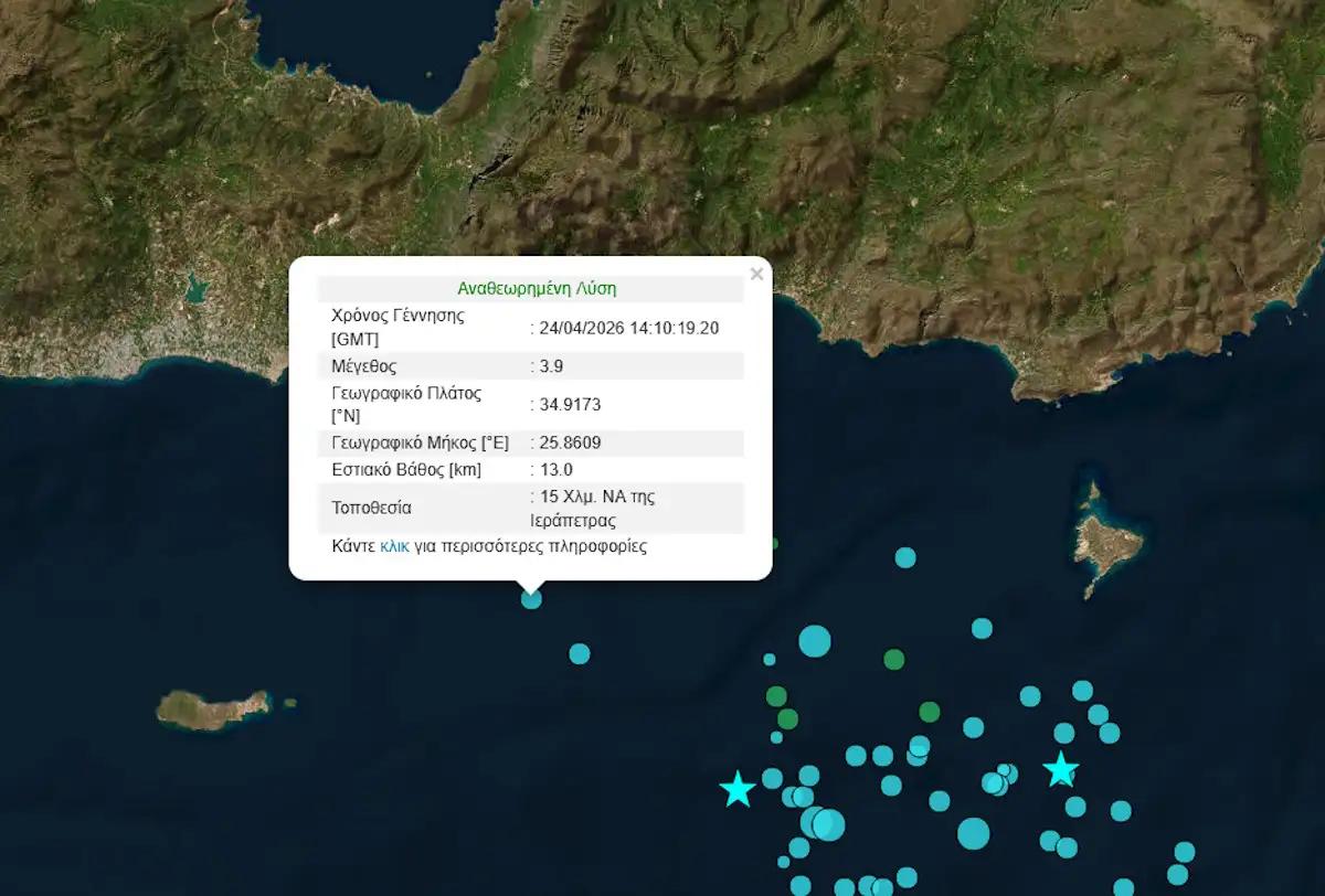 Ο σεισμός στο Λασίθι, έγινε στις 17.10 το απόγευμα της Παρασκευής (24/4/26) και σύμφωνα με την αναθεωρημένη λύση από το Γεωδυναμικό Ινστιτούτο, είχε μέγεθος 3,9 ρίχτερ.