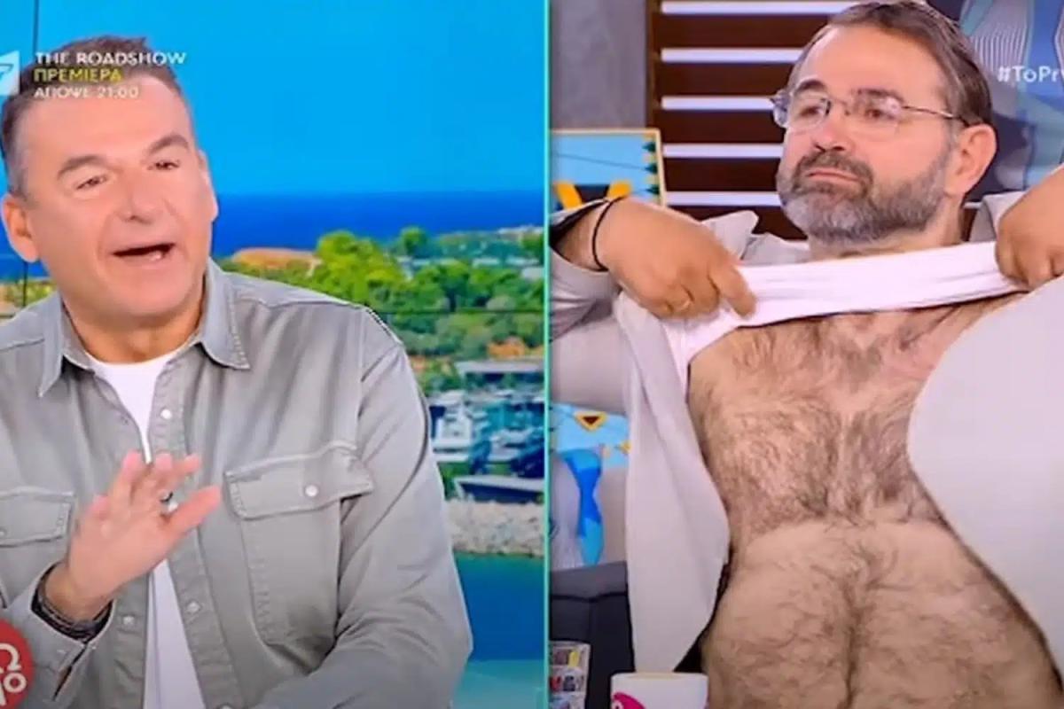 Ο Σταύρος Μπαλάσκας αιφνιδίασε το πάνελ της εκπομπής Το Πρωινό στον ΑΝΤ1, όταν ξαφνικά σήκωσε τη μπλούζα που φορούσε για να φανεί το στήθος του.