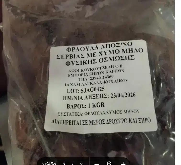 Ωστόσο στη συσκευασία του προϊόντος «Φράουλα αποξηραμένη με χυμό μήλου φυσικής όσμωσης», προέλευσης Σερβίας, σε πλαστική κλειστή συσκευασία 1 kg, με αριθμό παρτίδας SJAG0425 και ανάλωση κατά προτίμηση πριν από 23/04/2026, το οποίο διατίθεται από την επιχείρηση «ΑΦΟΙ ΚΟΥΚΟΥΤΖΕΛΗ Ο.Ε.» με έδρα στον 1ο χλμ. Λαγκαδά–Κολχικούmg/kg, δεν αναγράφεται η ουσία θειώδη η οποία είναι αλλεργιογόνος, ενώ θα έπρεπε να τονίζεται με είδος χαρακτήρων που κάνει σαφή διάκριση από το υπόλοιπο του καταλόγου των συστατικών.