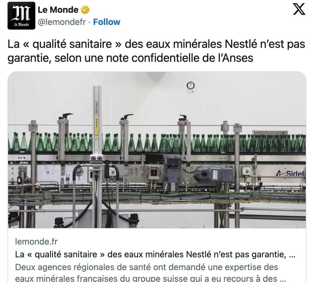 Το franceinfo και η Le Monde αποκάλυψαν το περιεχόμενο μιας εμπειρογνωμοσύνης που πραγματοποιήθηκε από την Υπηρεσία Ασφάλειας Τροφίμων (ANSES) στα νερά του ομίλου Nestlé και τα συμπεράσματα της οποίας υποβλήθηκαν στην κυβέρνηση τον Φεβρουάριο. Αυτή η έκθεση επιβεβαιώνει την εκτεταμένη μόλυνση με βακτήρια, φυτοφάρμακα, Pfas, φυσικών πηγών μεταλλικού εμφιαλωμένου νερού που διαχειρίζεται ο όμιλος Nestlé στη Γαλλία και διασφαλίζει ότι η ποιότητα της υγείας τους δεν είναι εγγυημένη.