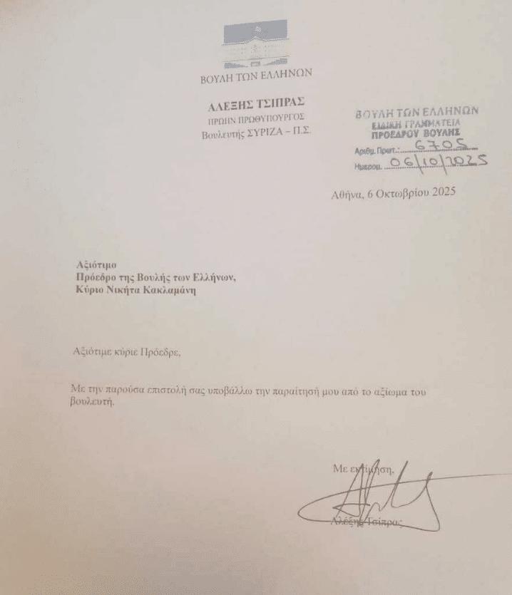Με επιστολή του προς τον πρόεδρο της Βουλής ο Αλέξης Τσίπρας δηλώνει ότι επιθυμεί να παραιτηθεί από το βουλευτικό του αξίωμα.