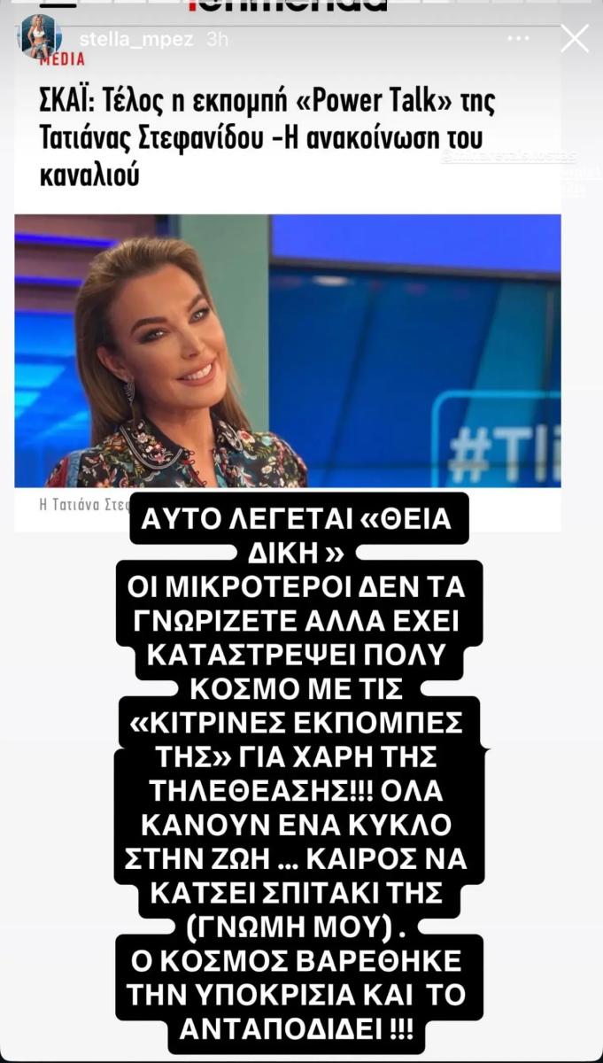 Ανεβάζοντας τη σχετική είδηση σε story, η Στέλλα Μπεζαντάκου έγραψε χαρακτηριστικά: «Αυτό λέγεται Θεία Δίκη. Οι μικρότεροι δεν τα γνωρίζετε, αλλά έχει καταστρέψει πολύ κόσμο με τις “κίτρινες εκπομπές” της για χάρη της τηλεθέασης. Όλα κάνουν έναν κύκλο στη ζωή. Καιρός να κάτσει σπιτάκι της (γνώμη μου). Ο κόσμος βαρέθηκε την υποκρισία και το ανταποδίδει!».