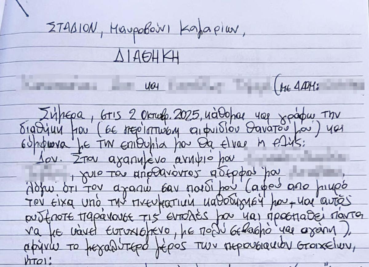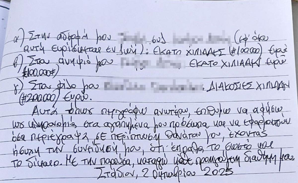 Σύμφωνα με πληροφορίες, οι αστυνομικές αρχές έχουν ήδη στα χέρια τους και προηγούμενη διαθήκη του 68χρονου, που φέρεται να είχε συνταχθεί πριν από περίπου έναν χρόνο και παρέμενε σφραγισμένη.