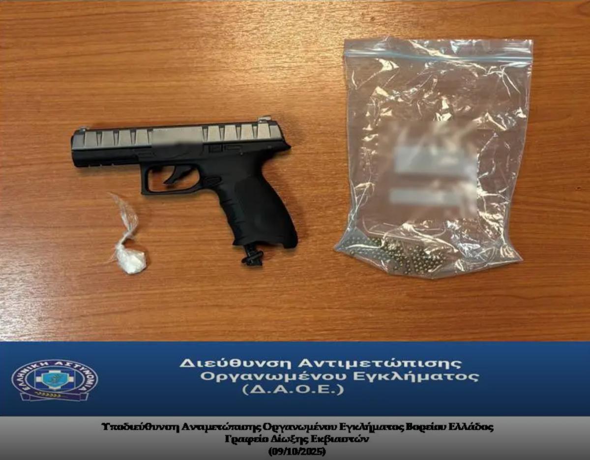 Στο πλαίσιο διενέργειας ειδικών ελέγχων του Τμήματος Δίωξης Εκβιαστών, εντοπίστηκε ο 36χρονος να κατέχει αεροβόλο πιστόλι, 103 μεταλλικά σφαιρίδια και αυτοσχέδια νάιλον συσκευασία που περιείχε κοκαΐνη μικτού βάρους 2,9 γραμμαρίων.