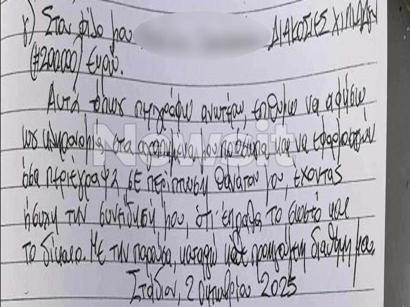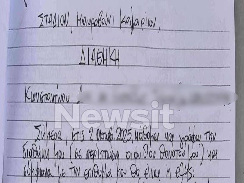 «Σήμερα, στις 2 Οκτωβρίου 2025, κάθομαι και γράφω την διαθήκη μου (σε περίπτωση αιφνιδίου θανάτου μου) και σύμφωνα με την επιθυμία μου, θα είναι η εξής», αναφέρει ο 68χρονος στην αρχή της διαθήκης του, πριν προχωρήσει στην κατανομή της περιουσίας του.