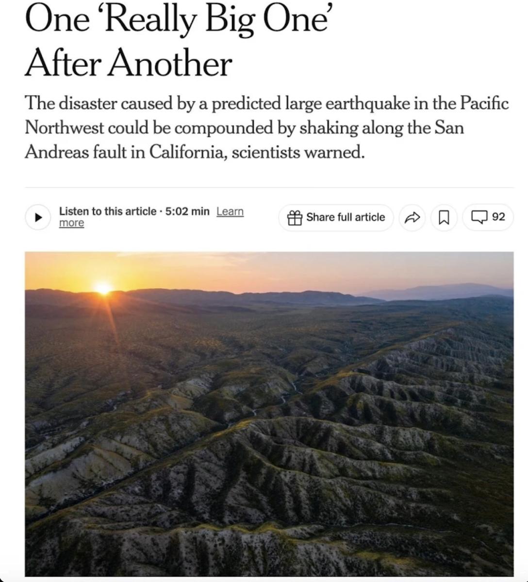 Ο καθηγητής του Πανεπιστημίου του Όρεγκον, Κρις Γκόλντφιντζερ, σημείωσε ότι ο σεισμός στην Cascadia θεωρείται ήδη πιθανώς ο πιο καταστροφικός στην ιστορία της Βόρειας Αμερικής. «Αλλά αν ο Άγιος Αντρέας εκραγεί την ίδια στιγμή, η καταστροφή θα είναι ακόμη μεγαλύτερη», λέει.