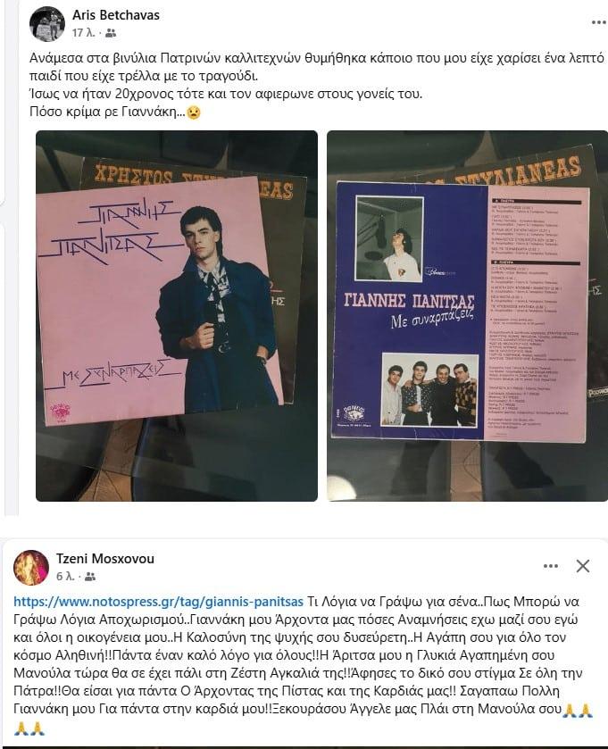 Bαθιά θλίψη έχει σκορπίσει στην Πάτρα ο πρόωρος χαμός του γνωστού τραγουδιστή Γιάννη Πανίτσα, ο οποίος «έφυγε» από τη ζωή σε ηλικία 55 ετών χτες Παρασκεύη (17/10), ενός ανθρώπου που σημάδεψε με τη φωνή και την παρουσία του τη νυχτερινή ζωή της πόλης.