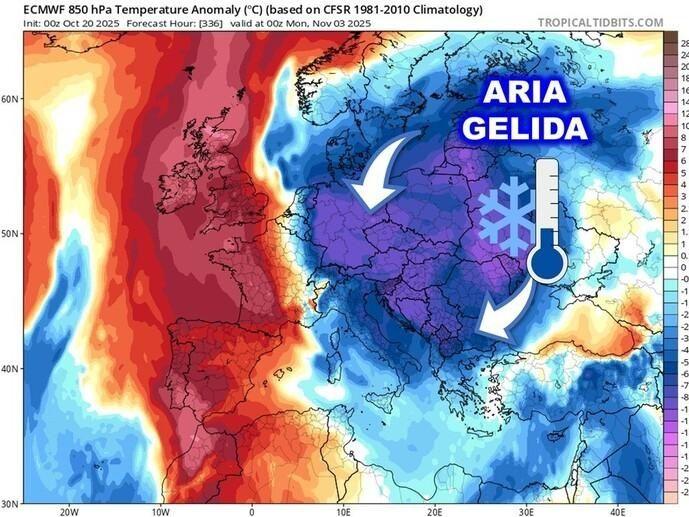 Από το Σαββατοκύριακο 2-3 Νοεμβρίου, το ψύχος θα αρχίσει να κατεβαίνει προς τη Μεσόγειο μέσω της Βόρας. Οι θερμοκρασίες αναμένεται να υποχωρήσουν κατά 7-8°C κάτω από τα κανονικά για την εποχή επίπεδα, γεγονός που προμηνύει έναν πρόωρο χειμώνα για πολλές περιοχές της Ευρώπης.