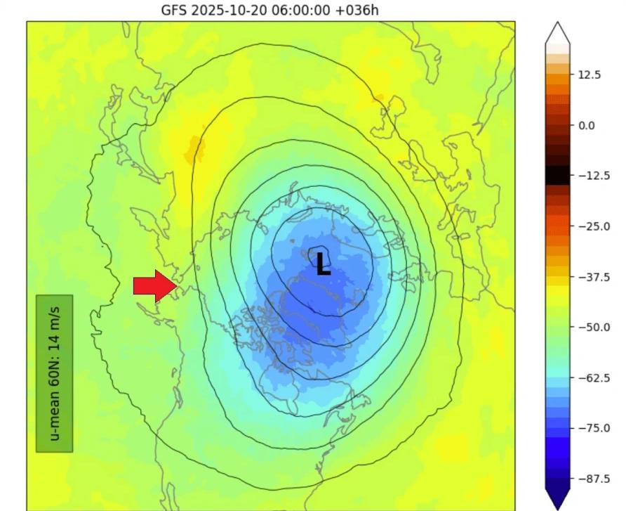 Ένα τέτοιο αντικυκλωνικό πεδίο πάνω από τον Ειρηνικό και τη Γροιλανδία πιέζει και «στραβώνει» τον στρόβιλο, μετατοπίζοντάς τον από το κέντρο του πόλου και εμποδίζοντάς τον να ενισχυθεί.
