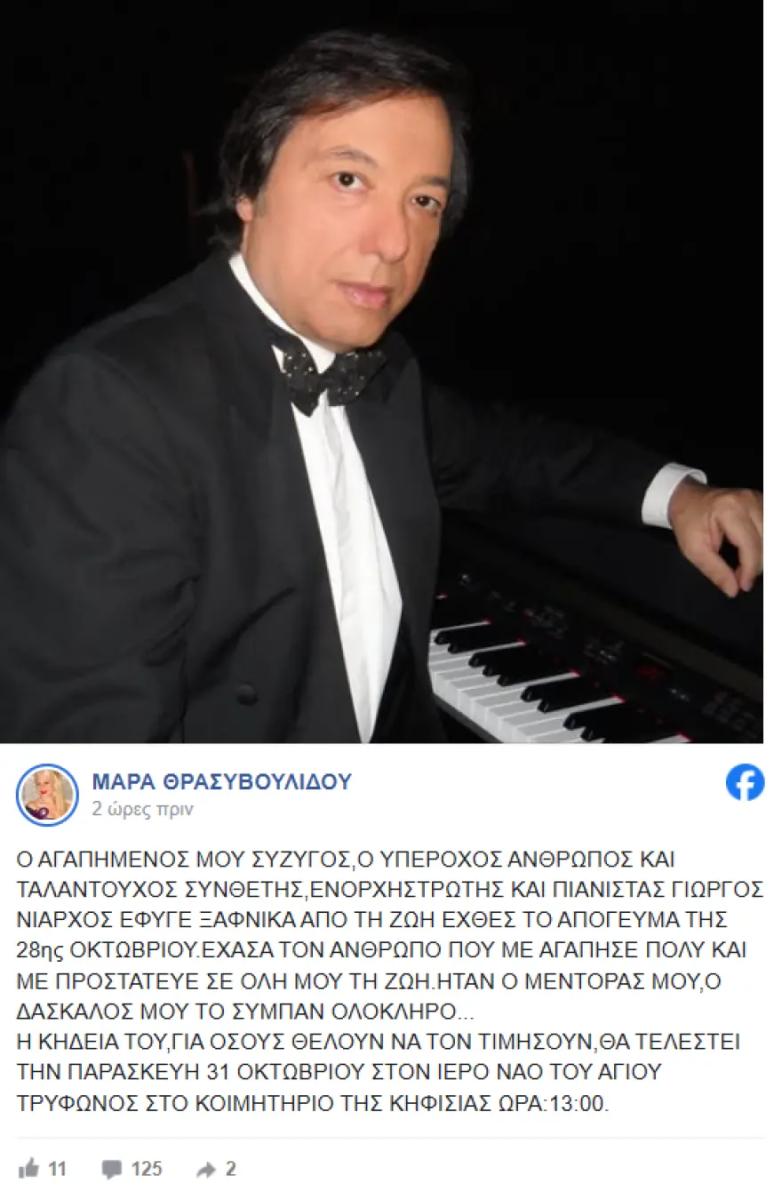 Συγκεκριμένα, έγραψε: «Ο αγαπημένος μου σύζυγος, ο υπέροχος άνθρωπος και ταλαντούχος συνθέτης, ενορχηστρωτής και πιανίστας Γιώργος Νιάρχος έφυγε ξαφνικά από τη ζωή εχθές το απόγευμα της 28ης Οκτωβρίου. Έχασα τον άνθρωπο που με αγάπησε πολύ και με προστάτευε σε όλη μου τη ζωή. Ήταν ο μέντοράς μου, ο δάσκαλός μου, το σύμπαν ολόκληρο. Η κηδεία του, για όσους θέλουν να τον τιμήσουν, θα τελεστεί την Παρασκευή 31 Οκτωβρίου στον Ιερό Ναό του Αγίου Τρύφωνα, στο Κοιμητήριο της Κηφισιάς, στις 13:00».