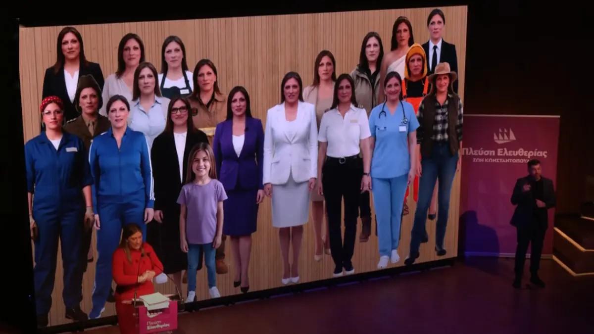Έντονη αίσθηση προκάλεσε ο τρόπος με τον οποίο η Ζωή Κωνσταντοπούλου επέλεξε να παρουσιάσει το πρόγραμμα της Πλεύσης Ελευθερίας. Η ίδια εμφανίστηκε –με τη βοήθεια της τεχνητής νοημοσύνης– σε μια σειρά από διαφορετικούς ρόλους, από γιατρός και πυροσβέστης μέχρι οικονομολόγος, εργάτρια, ψαράς, ακόμη και… στρατιωτικός. Μια παρουσίαση που έγινε πρώτο θέμα συζήτησης, όχι μόνο για το περιεχόμενό της αλλά και για την εκτέλεσή της.