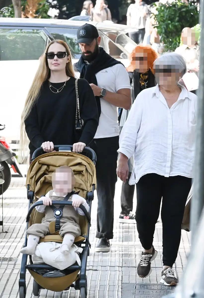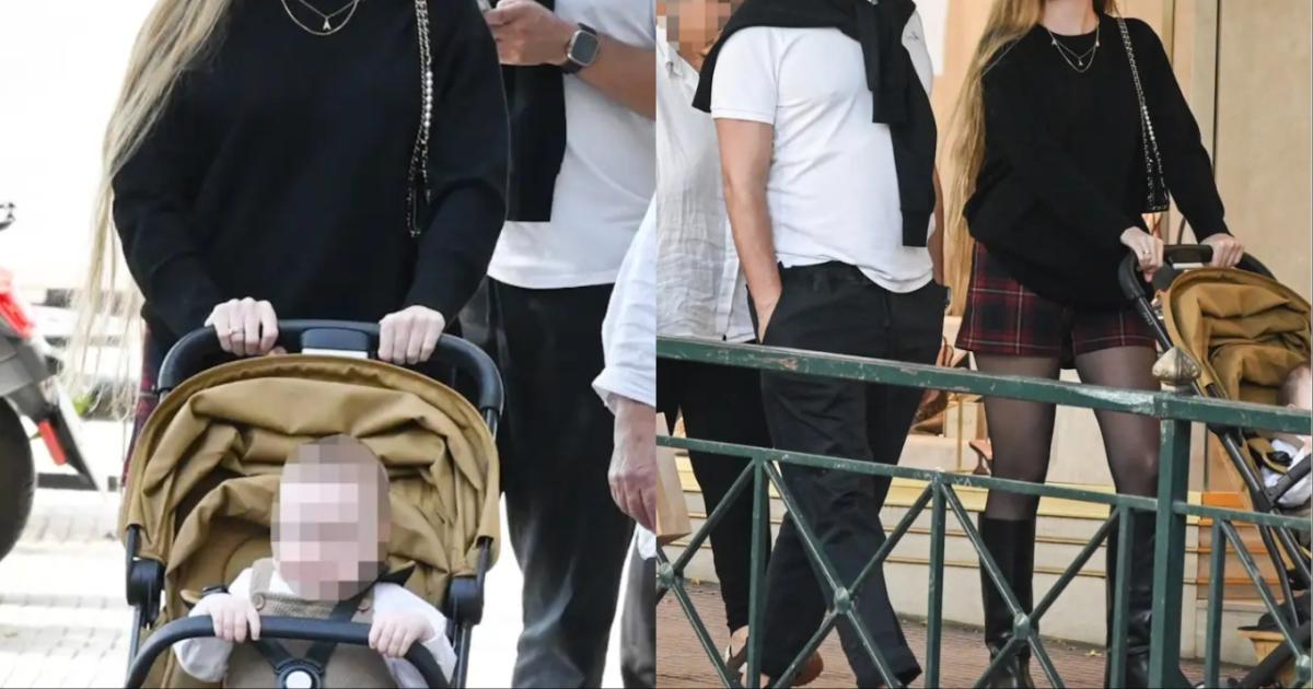 Η Αντωνία Καλλιμούκου έκανε τη βόλτα της στη Βουκουρεστίου, κρατώντας το καρότσι με το μωράκι της, ενώ ο σύζυγός της βρισκόταν στο πλευρό της.