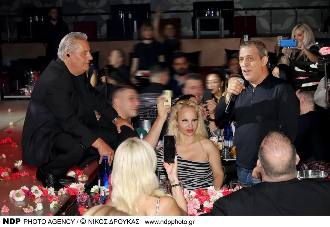 Και εκεί, στο κέντρο της διασκέδασης, ξανά ο απότακτος αστυνομικός, ο οποίος κάθεται πλάτη στον φακό. Αυτή τη φορά βρισκόταν στην παρέα του δημοφιλούς τραγουδιστή, εκείνο το βράδυ μάλιστα συνοδευόταν και εκείνος από την ξανθιά σύντροφό του.