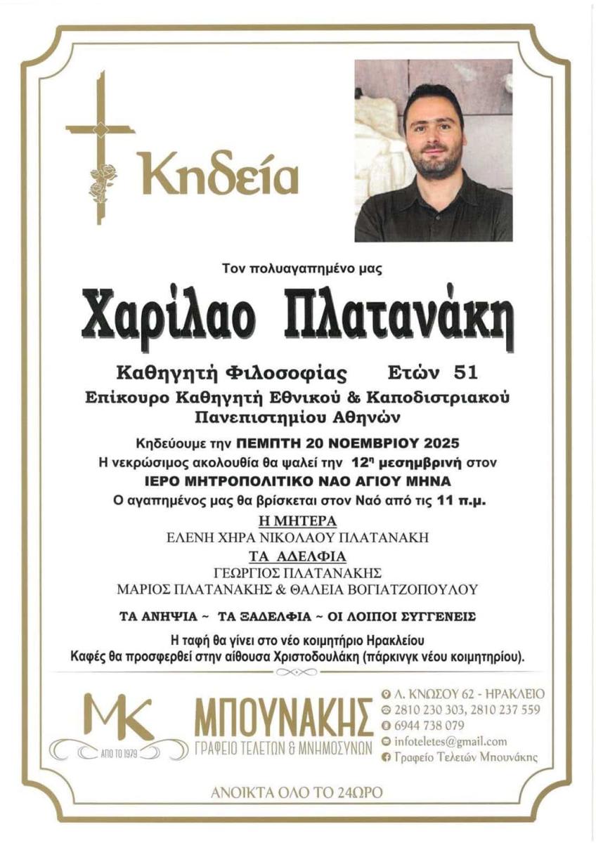 Θλίψη σκόρπισε στην ακαδημαϊκή κοινότητα η είδηση του θανάτου του 51χρονου Επίκουρου Καθηγητής Ελληνικής και Ρωμαϊκής Πολιτικής Σκέψης στο Τμήμα Πολιτικής Επιστήμης & Δημόσιας Διοίκησης του ΕΚΠΑ, Χαρίλαου Πλατανάκη.